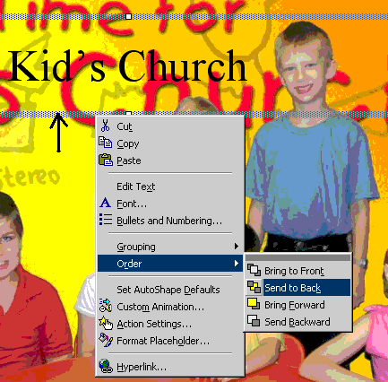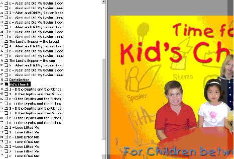I have selected the Kid's Church slide. It says "Kid's Church" because I named the slide "Kid's Church". To put a title on a slide you have made, just type the title you want after the slide number on the left of the screen. If the title shows up in the slide in which you have inserted a picture and you do not want it to do so, click on the title on the slide to activate it.