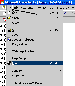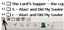 It's a good idea to have a printout of the song presentation to give to the person who will be flipping your slides. This will not only be a summary of what will happen, but it is the best place for you to write down any instructions that you wish to be carried out and when. I believe the best printout to be a copy of the "outline" of the presentation. This turns out to be a list of the slide titles only. Your song presentation will fit on two or three sheets at the most. First, let me suggest that you use the "normal" screen view and not the slide view where you can't read the slides anyway. To get there, click on the Normal View icon at the lower left of the screen.