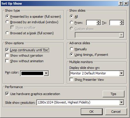 This is also where you set your system up for dual monitors, if you have a second video card and monitor. And this is where you can set up for the native resolution of the projector, which is a good idea. While you are at it, turn the hardware graphics acceleration ON. With Presenter View now turned on, bring up a PowerPoint file. PowerPoint will load the file then change over to the new Presenter View.
